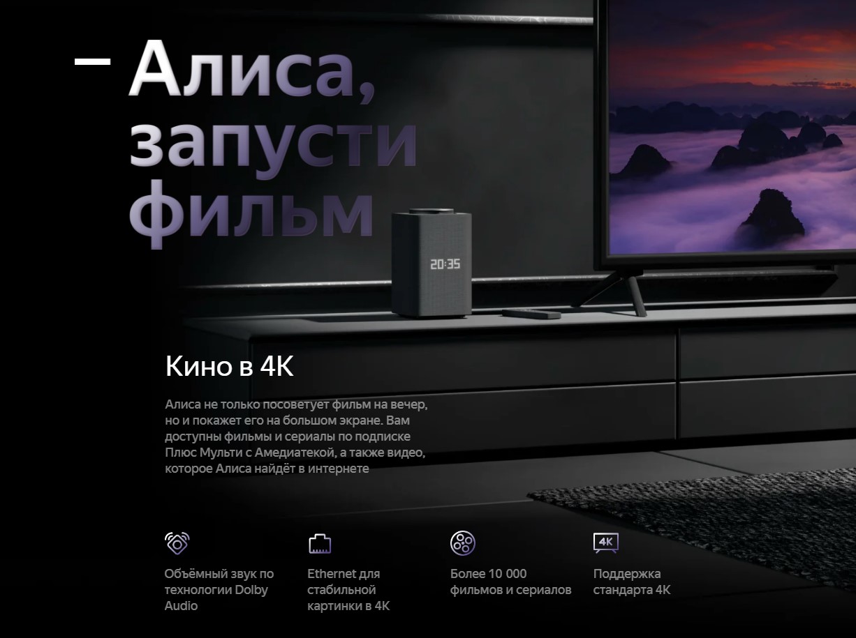 Алиса не только посоветует фильм на вечер, но и покажет его на большом экране. Вам доступны фильмы и сериалы по подписке Плюс Мульти с Амедиатекой, а также видео, которое Алиса найдет в интернете.