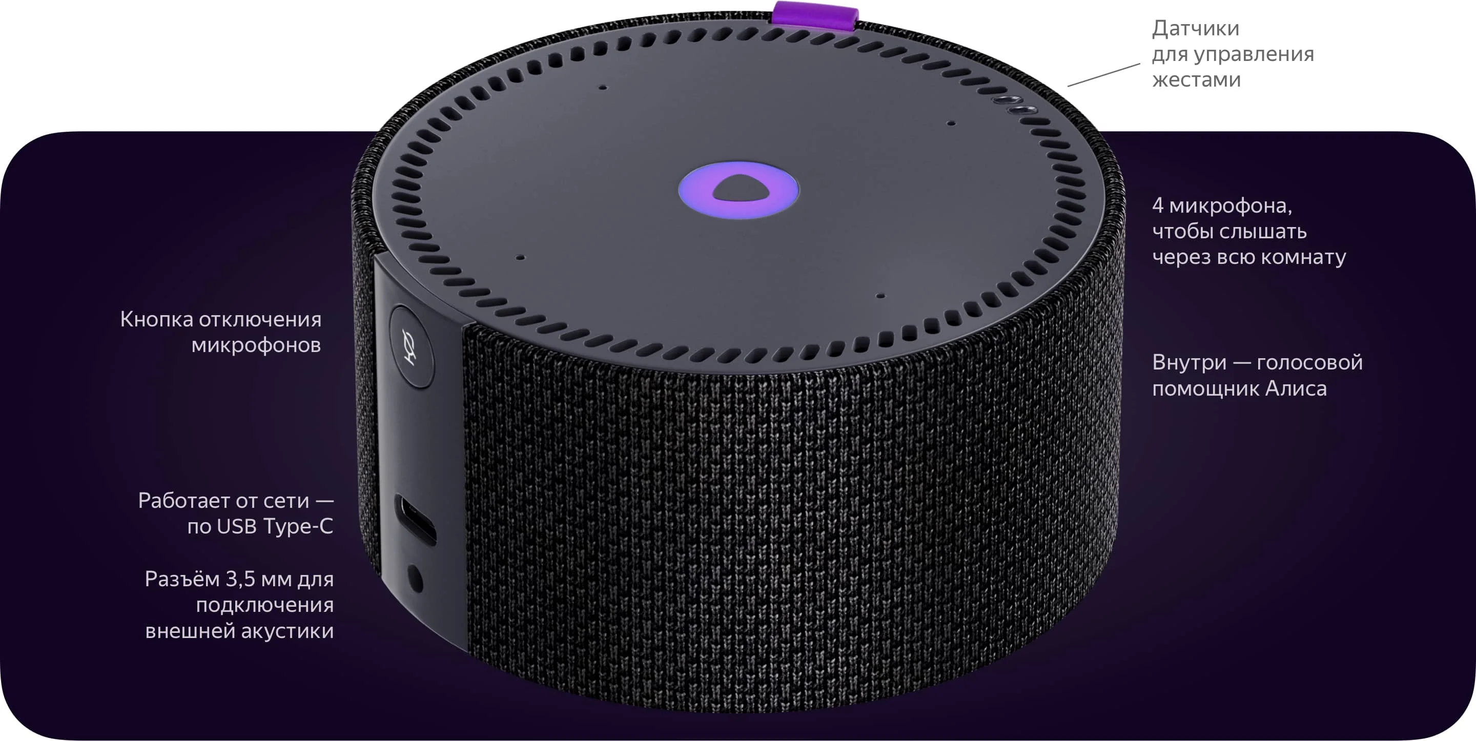 Яндекс.Станцию мини необходимо подключить к розетке при помощи провода. Встроенного аккумулятора в устройстве нет, но это не значит, что оно будет бесполезно в машине или на природе. Можно использовать пауэрбанк.