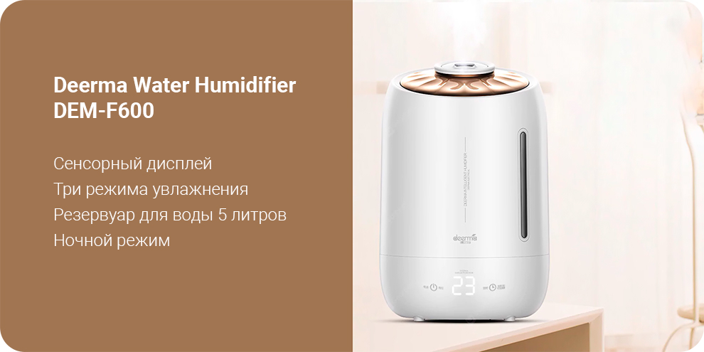Умный и многофункциональный увлажнитель воздуха Xiaomi Deerma Water Humidifier DEM-F600 имеет три режима работы и большой сенсорный дисплей для удобства управления. Устройство имеет функцию отслеживания температуры в режиме реального времени. У увлажнителя есть дополнительный резервуар с ионами серебра, который подавляет размножение более 99% бактерий, удаляет налет, улучшает свойства воды и поглощает загрязнения.
