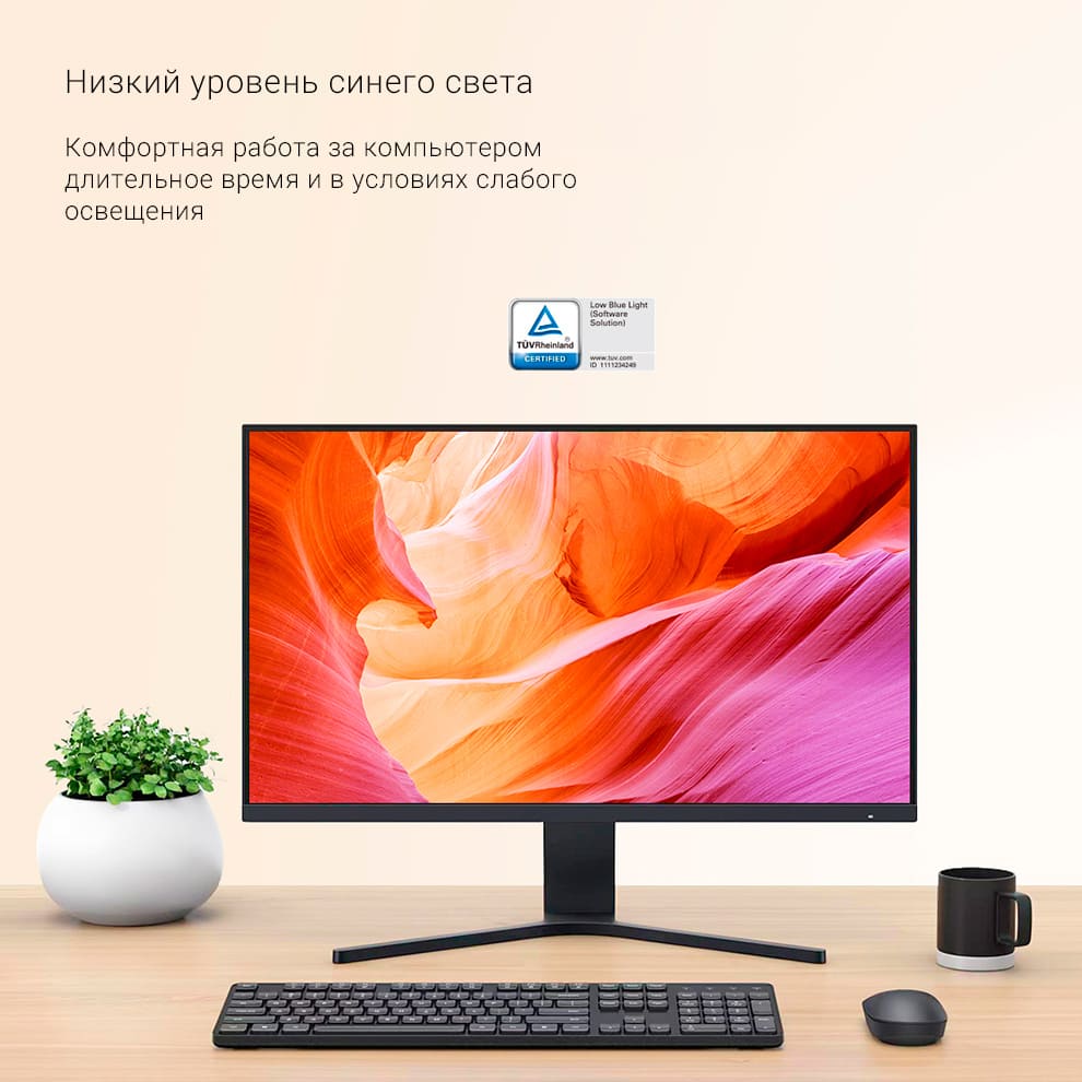 Redmi Display 27” получил специальный сертификат, подтверждающий низкий уровень синего свечения. В условиях слабой освещенности глаза пользователя не устанут даже после длительной работы за компьютером.