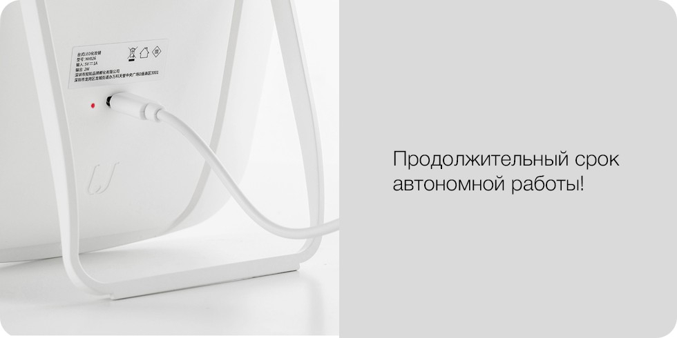 Зеркало работает без проводов от литиевого аккумулятора емкостью 2400 мАч, обеспечивающего продолжительный срок автономной работы. С таким зеркалом Вы сможете устроить персональную гримерку в любом помещении.
