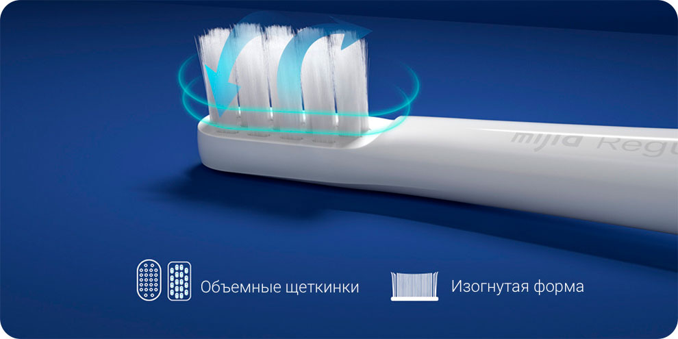 Закругленная головка с мягкими объемными щетинками проникает глубоко в десны не оставляя частиц еды.